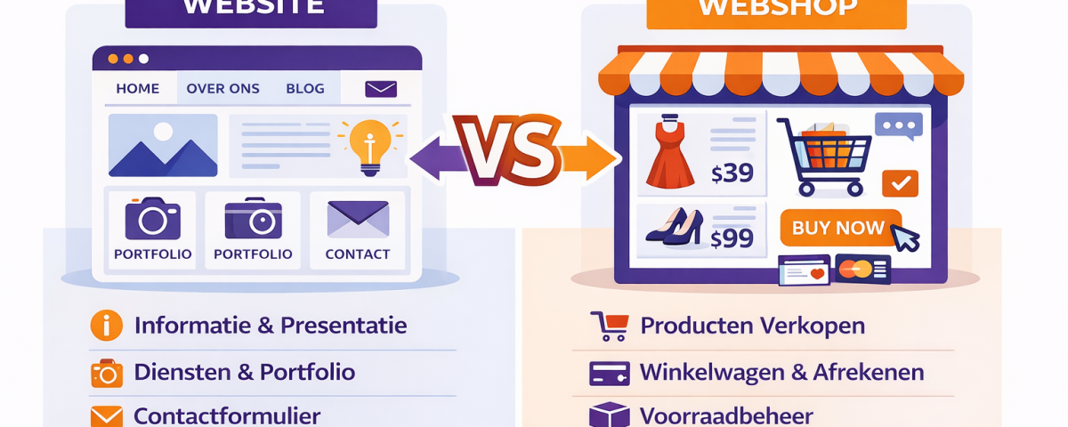 Het belangrijkste verschil tussen een website en een webshop is het doel. Een website informeert en presenteert; een webshop verkoopt en verwerkt transacties. Door dit verschil goed te begrijpen, kun je een slimme keuze maken die past bij jouw onderneming en klanten.